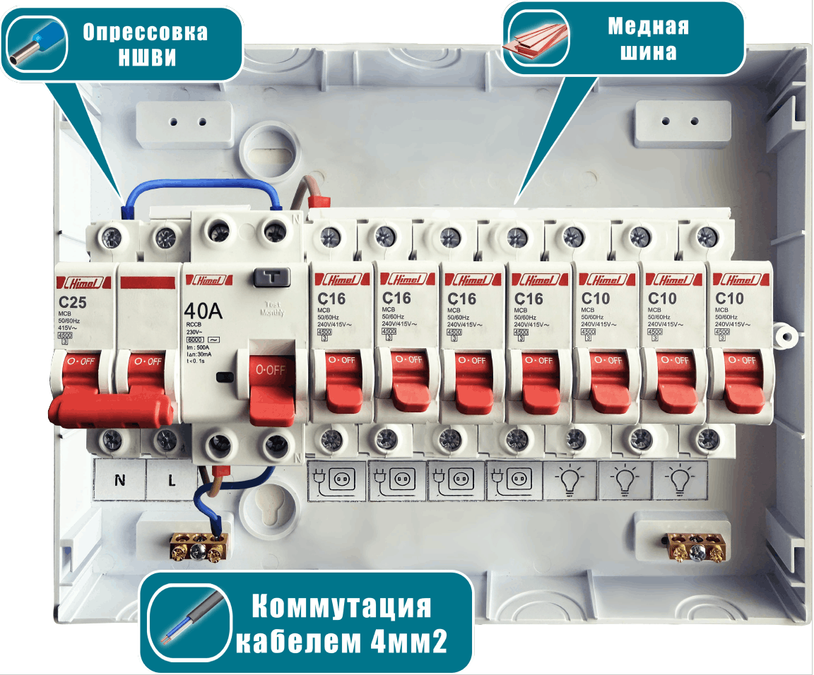 Двухполюсный вводной автомат на 25А, Устройство защитного отключения (УЗО) на 40А, Автоматы на розетки С16А, на освещение С10А